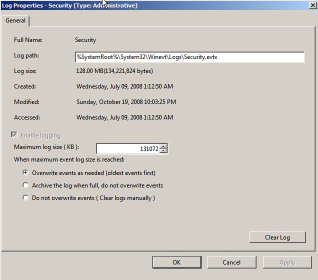 that point. Don’t choose the Do not overwrite events (Clear logs manually)option; if you do, Windows will just stop