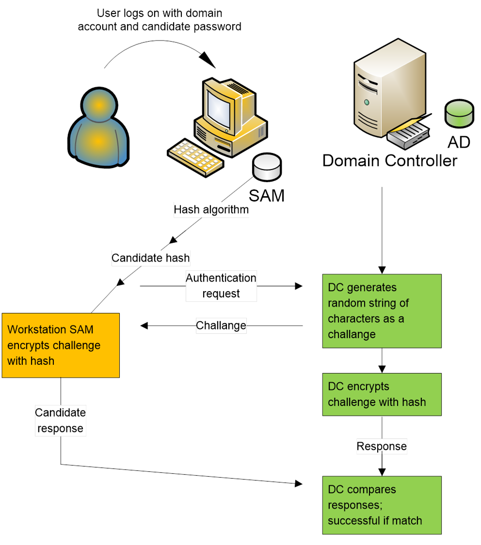 NTLM is a challenge/response protocol shown in the diagram below. When a user attempts to log on to a workstation, the computer contacts the