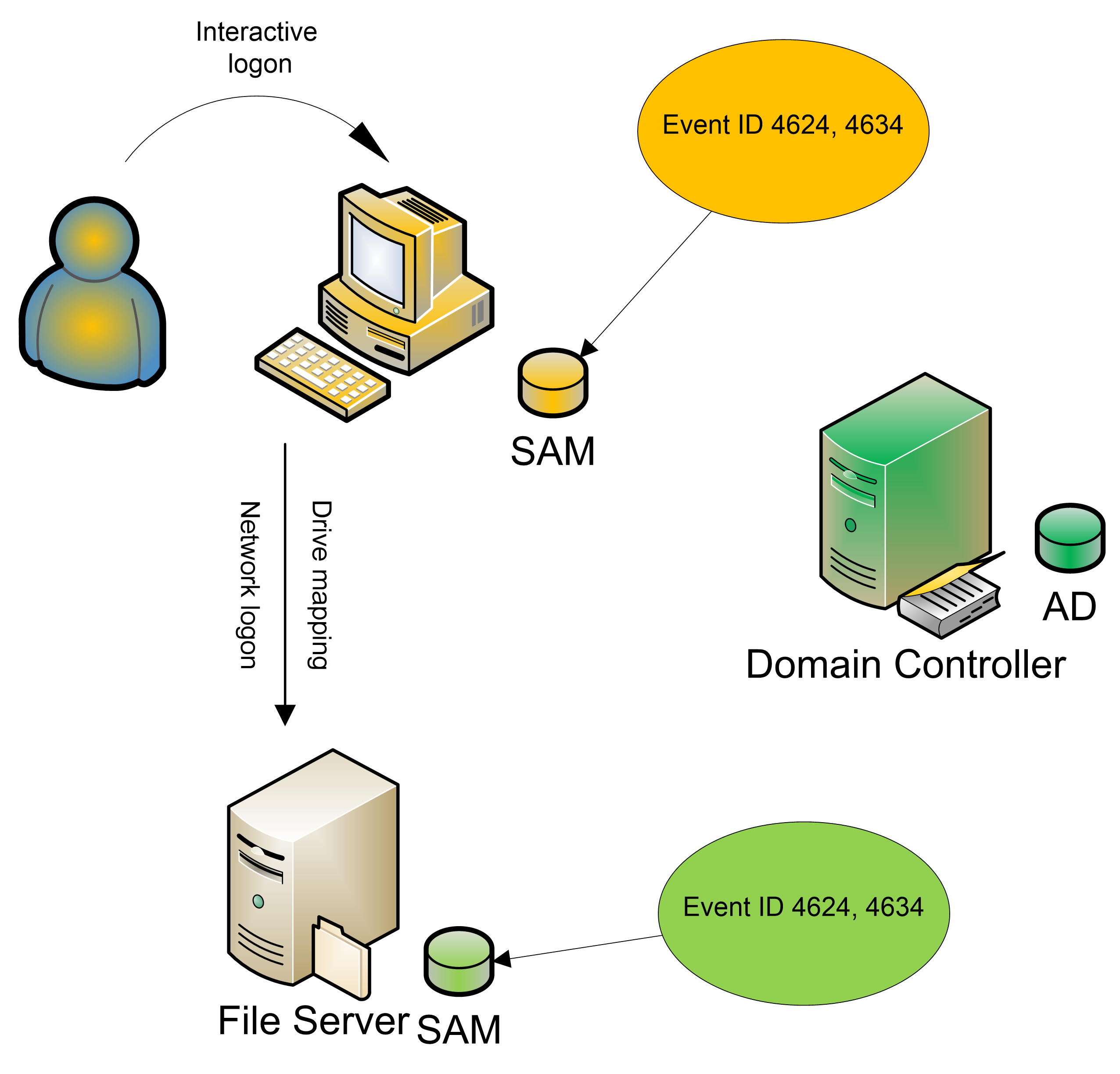on DCs, Logon/Logoff events are found on every system in the domain. The diagram below demonstrates the event IDs that are recorded when a user initially logs on